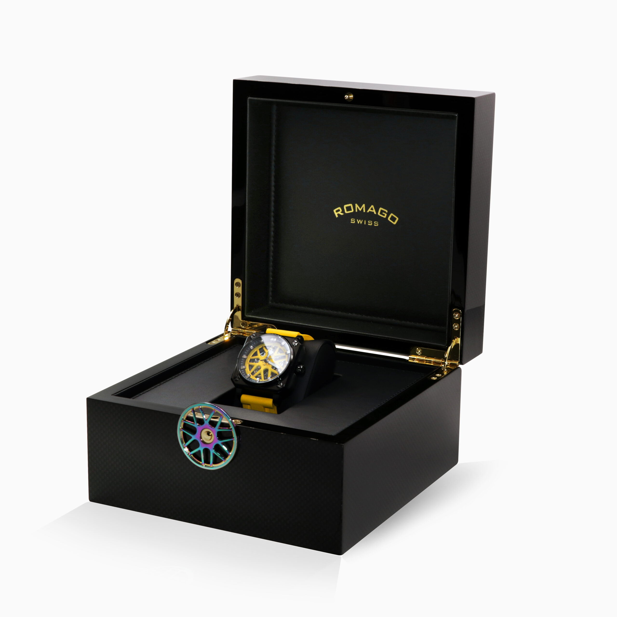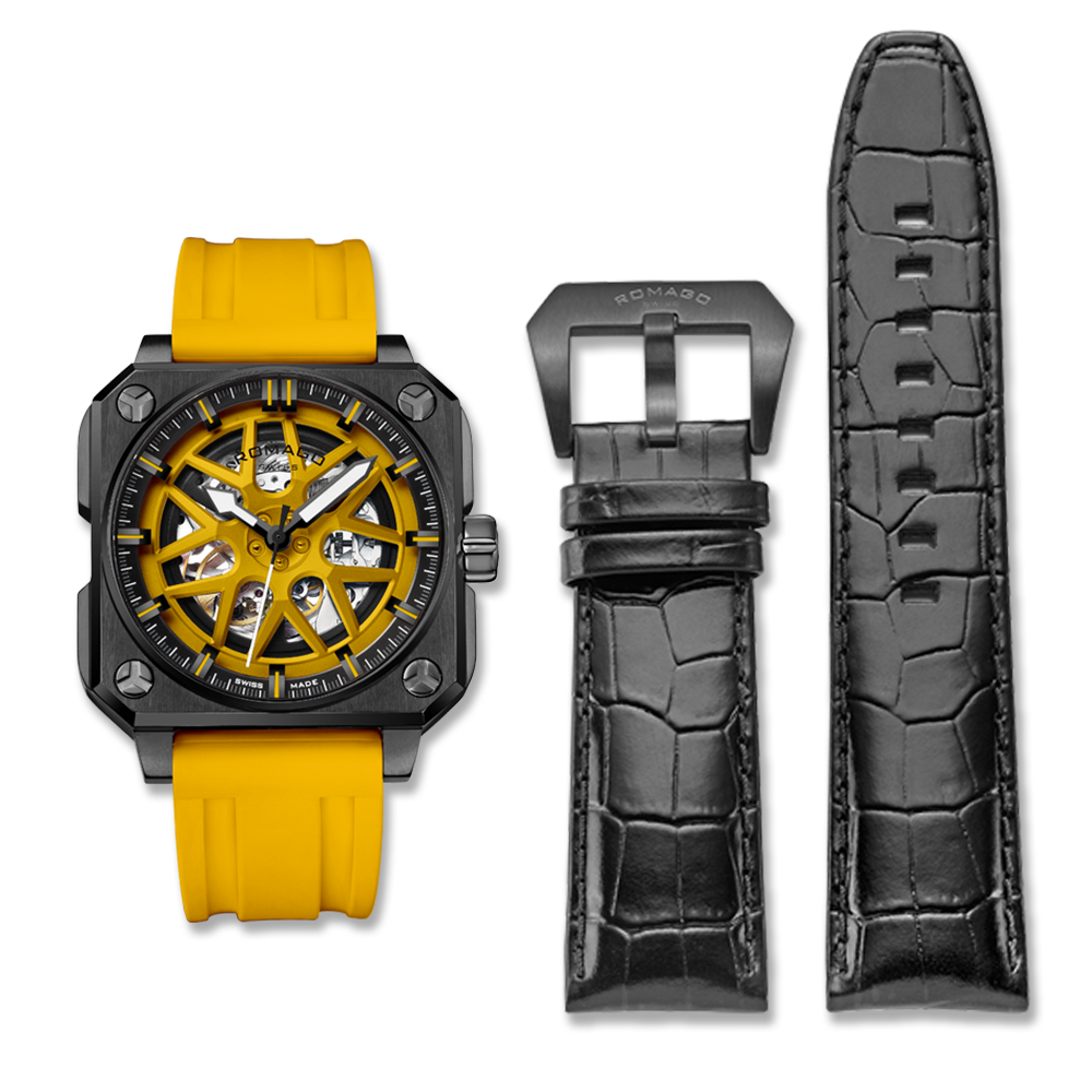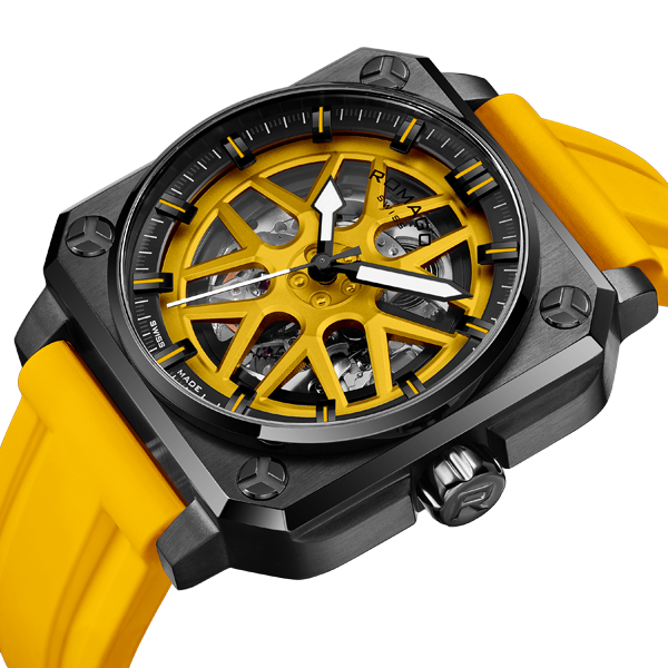 Extremely strong and bold one which is rare in the industry. 46.5 mm symmetrical case is made from stainless steel and comes with silicon strap and rotate dial. Swiss made automatic skeleton movement, whose architecture complex displays along with the wheel design at the front and bottom part, has a guaranteed 50 m waterproofness. With its elegant colour combination, the model is available in a limited edition.
