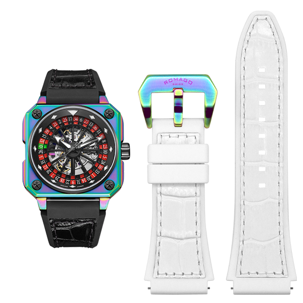 This 46.5 mm automatic model has a stainless steel case and a multi-material strap in black to match with the roulette design of the dial. Skeleton movement is Swiss made with the house’s aesthetics which is also reflected on the star-shaped screws. The transparent case back features an open-worked rotor with shielding design. Water resistance is up to 50 m which is more than enough in every circumstance. In unveiling the first ever model in the roulette layout, Romago is showcasing a new exercise in horological creativity with the rotatable system as well as the high-level craftsmanship by applying extremely precise measurement.