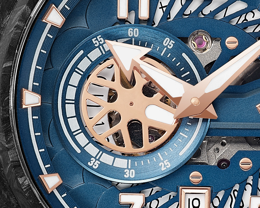 Replacing the small second hand with the wheel-shaped rotating disk, this unusual and functional design which inspired by the racing car touches the whole off-centre arrangement of the watch-dial up while defining the higher stage of creativity.